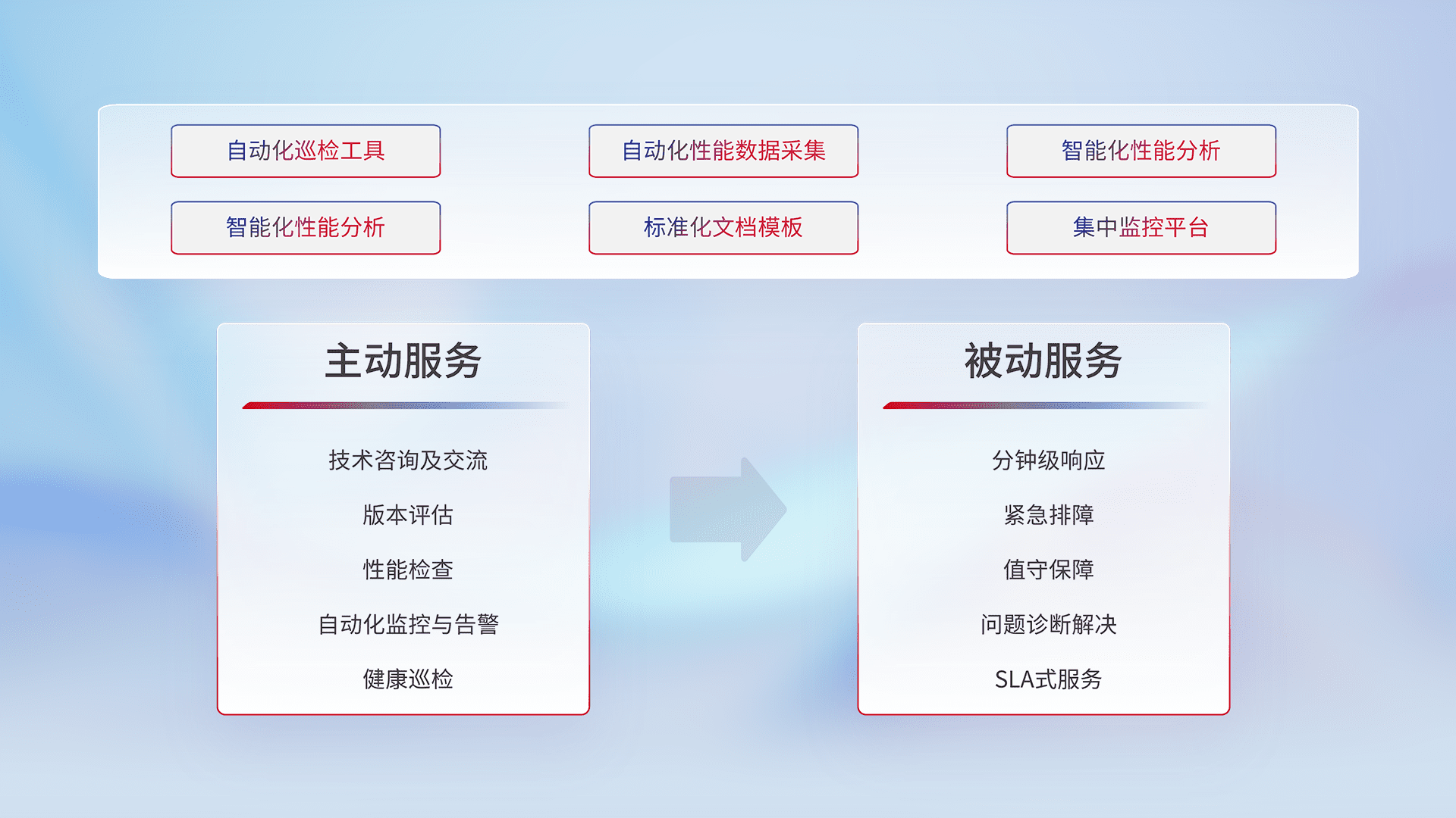智能化工具和标准化文档,,,,保障服务质量,,提供主动服务(包含技术咨询、、、版本评估、、、性能检查、、、、自动化监控与告警、、、健康巡检)和被动服务包含(分钟级响应、、紧急排障、、、、值守保障、、问题诊断解决、、、、SLA服务)。。。