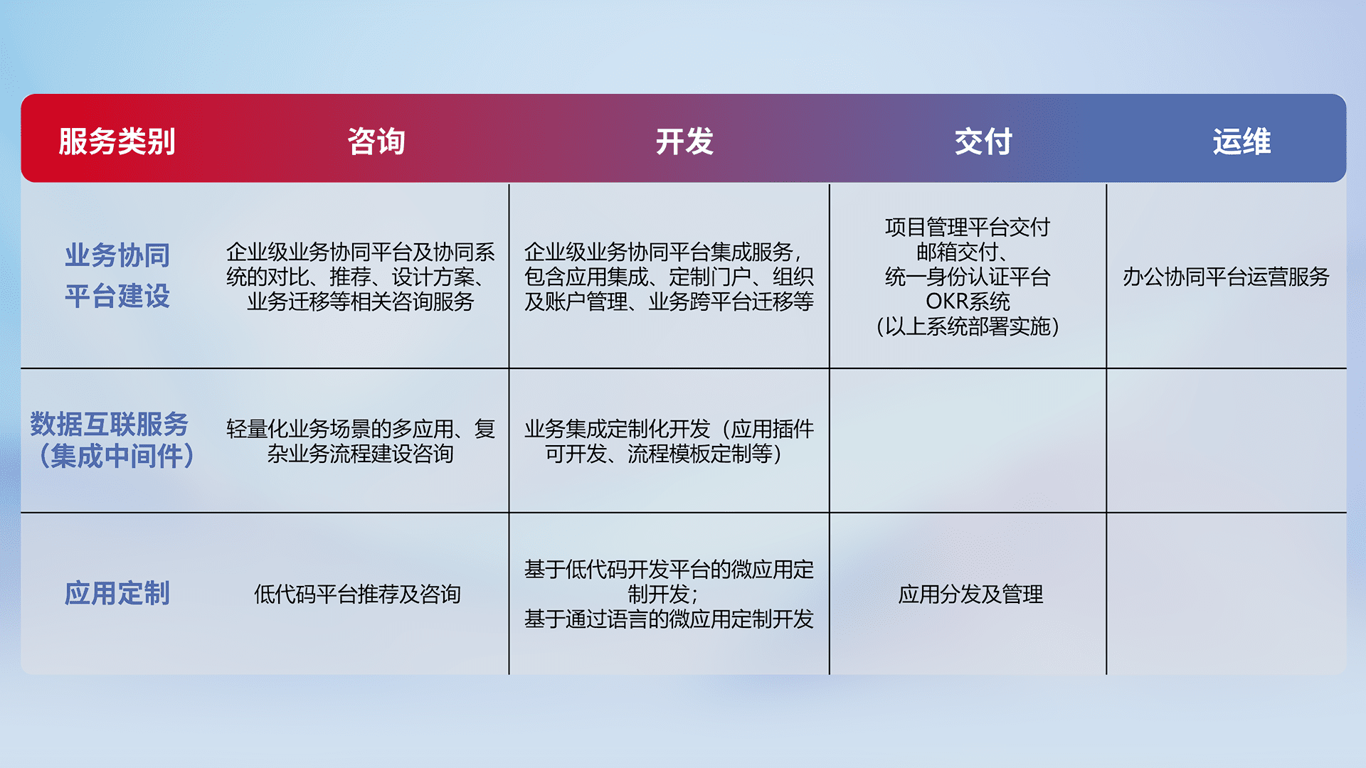 针对钉钉、、、、企微、、、、IDaas等平台级产品提供产品的规划、、、、方案、、、交付、、定制化开发等服务,,,实现如统一协同办公、、智能客户服务、、、、混合会议管理、、智能数据查询、、等业务场景,,实现数字化转型。。